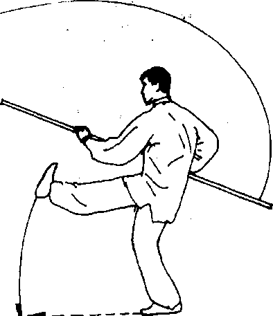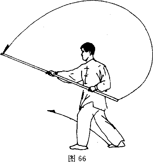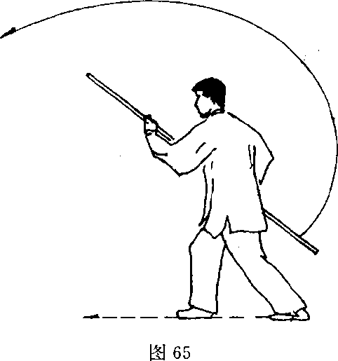 (1) 接上势。身体重心前移,右脚向前上一步,上体右转;同时 双手滑握棍身,使棍把向前劈出,棍梢经右腿外侧摆至身后;目视棍把(图65)。(2)上体左转,左脚向前上一步;同时双手握棍继续向前抡劈 至身前方,棍梢高与头齐,棍把经身体左侧下摆至身后,左手贴俯 于左腰侧;目视棍梢(图66)。(3)右脚屈膝提起向前蹬出,高与髓平;左手滑握棍把经上向 前劈出;右手随之滑握棍身,使棍梢经右腿外侧摆至身后;目视棍 把(图67)。 /〔要点〕进步抡棍要连贯,蹬腿与劈把要同时发劲。
