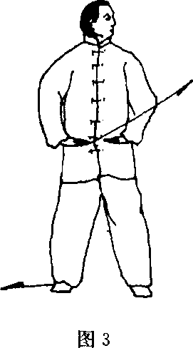 (1) 两腿并立,两臂自然下垂,身体成立正姿势,两眼向前平 视;做到:头正、项竖、收颁、气沉、心静、体松(图1)。