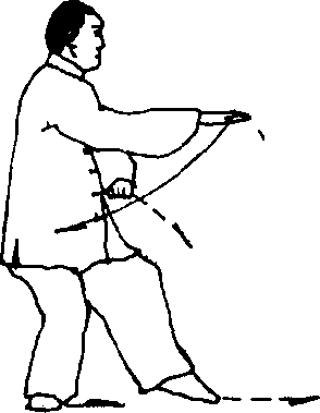 (1)右脚向右撤跨半步,膝微屈,左脚随之收提,脚尖虚点地; 同时身体半面向左转体,右掌外旋向前撩抄,掌心向前,等高与 胸齐,左臂外旋向上向内屈肘划弧,在体前与右臂相交,左掌变 拳,拳心向下;目视前方(图4)。