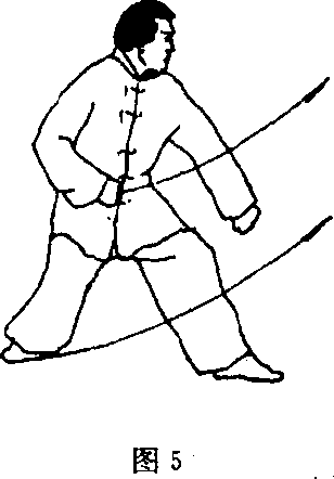 (2)右臂内旋,掌变拳屈肘回收停于腹前,右臂紧贴腰腹部; 左掌从右臂里侧向前下屈臂前撑,立掌停于左膝前方,拳面向下, 两腿屈膝半蹲成半马步;目视左前方(图5)。