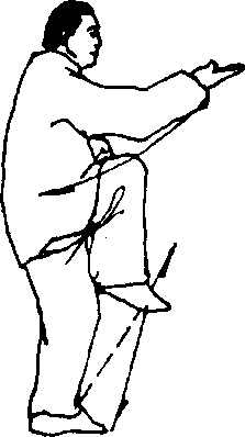 (1) 重心前移,左腿独立,膝微屈,右腿屈膝前提,足尖下垂, 膝高过腰;同时右拳变掌,掌心向上,由下向前上抄起,掌高与 肩齐,左拳变掌前伸,然后回收于左胸前,掌心向下;目视右掌 (图 6)。