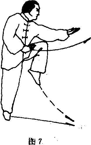 (2) 右脚在左脚内侧迅速震脚落地,左腿随即迅速向上提起, 膝高与腰肋齐,足尖自然下垂成右独立势;同时右掌内旋,掌心 向下,屈臂收置胸前,左掌臂外旋,由下向前上翻掌上托,肘微 屈,掌高与胸齐;目视左掌(图7)。