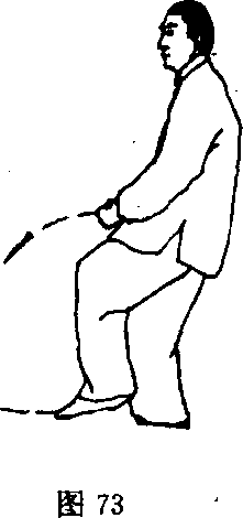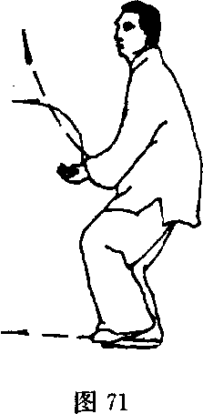 (1)接上势,右脚向后撤一步,左脚随之后撤屈膝提脚于右 腿内侧,成右摩胫步;同时左掌经右掌背上向前伸,至体前两掌 臂外旋使掌心翻转向上,同时向怀中捋拉(图71)。