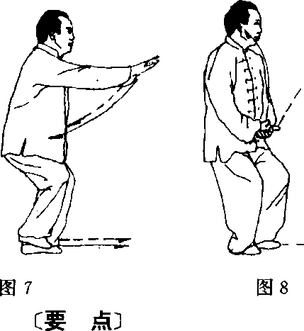 (1) 接上势,上体不变,左掌不动,右掌前伸与左掌平行,两 拇指尖相靠;同时右脚前进一步,随即右脚跟进,屈膝收提于右 踝里侧,成左摩胫步;目视两掌(图7)。