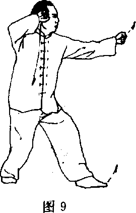 (3) 左脚向前进一大步,右脚跟进半步;同时右掌向前上方钻 拨,沉肩垂肘,拳心向外置于右耳眉之间,左掌变拳向前冲出,拳 眼向上,高与胸平;目视前方(图9)。