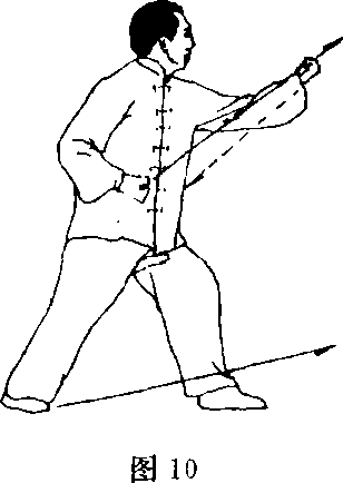 (1) 接上势,左脚外摆,重心略前移,两腿成左弓步式;同时 左臂外旋,拳心向上,拳面向前拧顶,右拳臂外旋屈肘下落收抱 于右腰腹前,拳心向上;目视左拳(图10)。
