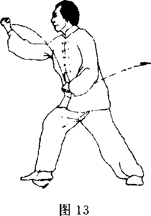 臂外转,收抱于左腰侧。右拳经左臂上方向前上钻出,拳高与眉 齐,拳心向上;目视右拳(图13)。