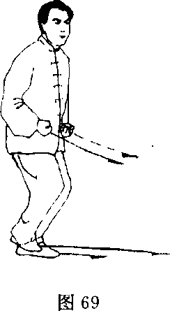 (1) 接上势,左脚向左前方上一步,右脚跟步,收提于左脚内 踝侧,成左摩胫步;同时两掌向上,向外再向下划弧,掌心向上 收置于骄部两侧;目视右前方(图69)。