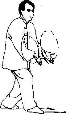 (1)接上势,上体左转180度,右脚里扣,左脚向左后方摆步; 同时左掌随体转向左侧横摆,掌心向外,高与肩齐,右掌变拳收
