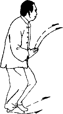 (1) 接上势,右脚向前垫步,左脚跟步,收提于右脚内踝侧, 成右摩胫步;同时两掌小臂内旋,经胸前回收向腹部下按,掌心 向前,两臂贴近腰腹部;目视左前方(图71)。