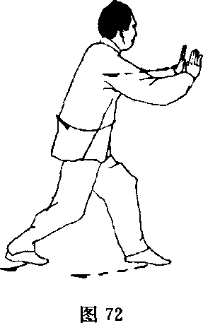 (2) 左脚向左前方上一步,右脚跟进半步,两腿屈膝成三体 式;同时两掌由胸前向前扑劈,掌指斜向上,肘部微屈,力达双 掌;目视两掌(图72)。