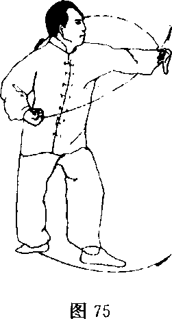 抱于右腰侧;目视左掌(图75)。