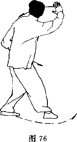 (2)身体左转,右脚向左脚前方上一步,脚尖内扣。两腿微屈; 同时左掌顺势下落收于左腹前,右掌屈臂上抬停于头部右侧(图 76)O