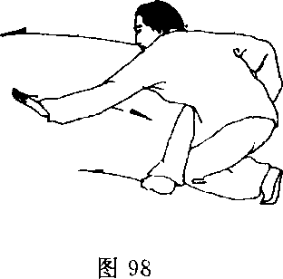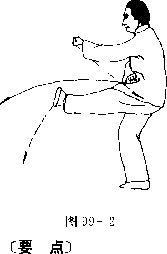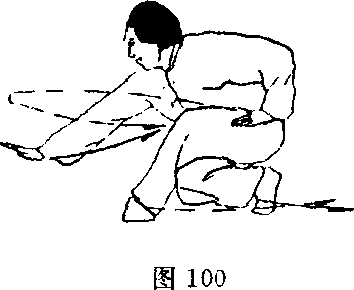 (1)接上势,两腿起立,右脚向前上步,然后右腿挺膝蹬地向 前纵跳,左腿随之屈膝前提,向前下横踹,脚尖外摆,高与膝齐; 同时右掌变拳向前,左掌变拳收回腹前,在右腿纵跳、左腿前踹 的同时两臂在身前相交,右拳在下收于左腹前,拳心向下,左拳 经右拳上方向前上钻出,拳心向上;目视前方(图99—1、图99 一2) o(2)左腿前落横踩,两腿屈膝全蹲成左歇式;同时右掌直臂前 探,掌心向下,掌指向前,掌高与膝齐,左掌收回于左胯旁,掌 心向下;目视右掌(图100)o纵跳要远,蹬踹高不过胯,力达脚掌。