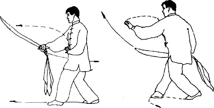(1) 接上势c上体左转佐脚经右脚内侧弧形向左摆步;同时右 手持刀前臂外旋向上伸举,刀身至身体右侧,刀刃向上,刀尖向后, 左掌手臂外旋由前向后、向下屈肘经脸前下摆至腹前,掌心向下, 头向左转,目平视前方(图60)。