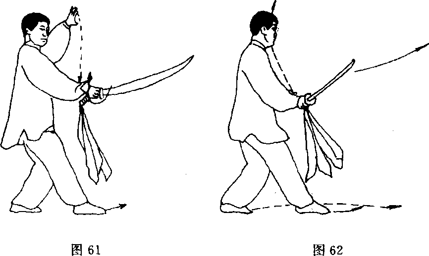 (1)接上势.右脚向前上一步;同时右手持刀旋臂翻腕,刀身回 挂至身体右侧,刀刃向前,刀尖斜向上,左掌随之附于右腕,掌出向 下,目平视前方(图62)。