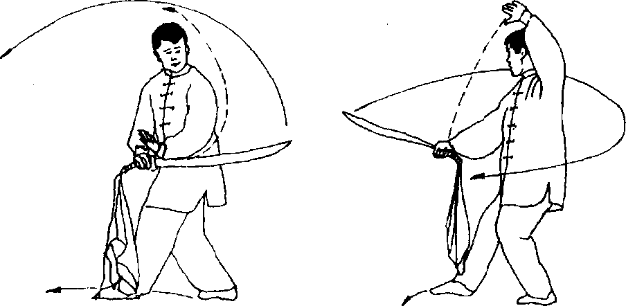 (1) 接上势。上体左转,左脚向右斜前方上一步,脚尖外展;同 时右手持刀由前向后下挂,至左髓侧,刀尖向后,左掌附于右腕随 之运转;目视刀尖(图88)。
