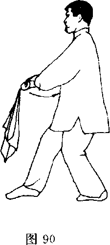 (2) 上体右转,右脚向右斜前方上一步,左脚不变,成顺三体式 步;同时右手持刀经身体左侧向上,向前抡劈至腹前,刀尖向前,高 与腹平,左掌随之经左上举至头部左侧上方,掌心斜向外;目视刀 尖(图89)。