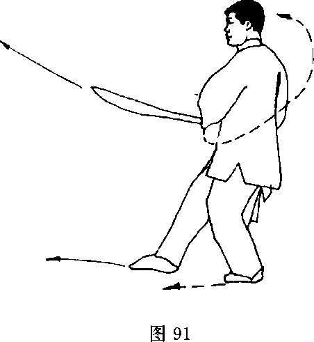 (1) 接上势。上体右转,身体重心后移,两脚不变3同时右手持 刀后抽至右腰侧,刀刃向下,刀尖向前,左掌附于右腕;目平视前方 (图 91)。