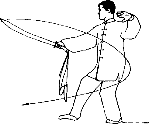 (2) 上体左转,右脚向前上一步,左脚随之跟步成顺三体式步; 同时右手持刀向前扎出,刀尖向前,高与肩平,左掌随之经左向上 架至头部左侧,掌心斜向下;目视刀尖(图92)。