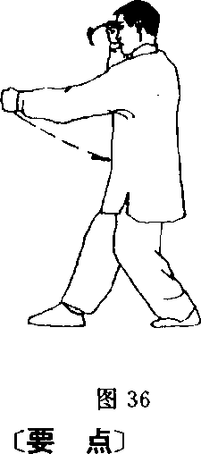 接上势。右脚向前上一步,'左脚跟进半步成拗三体式步;同 时上体向右拧转;右拳小臂外旋,屈肘向右上方格架于头部右侧, 拳心向外,高略低于头;左掌随之变拳,小臂内旋向前冲出,'拳 眼向上,高与肋平;目视左拳(图36)。