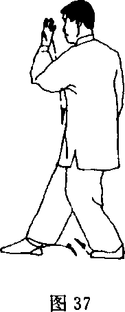 (1) 接上势。两脚不变,上体略向左转,同时右拳变掌,小 臂外旋抹摆至面部左侧,掌指向上,掌心向内;左拳随之变掌,小 臂外旋回收至脐部左侧,掌心向上;目视前方(图37)。