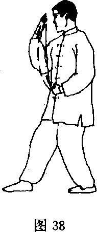 (2) 上体略向右转,两脚不变;同时左掌经胸前向面部左侧 抹摆,掌指向上,掌心向内;右掌随之屈臂下落至脐部右侧,掌 心向上;目视前方(图38)。