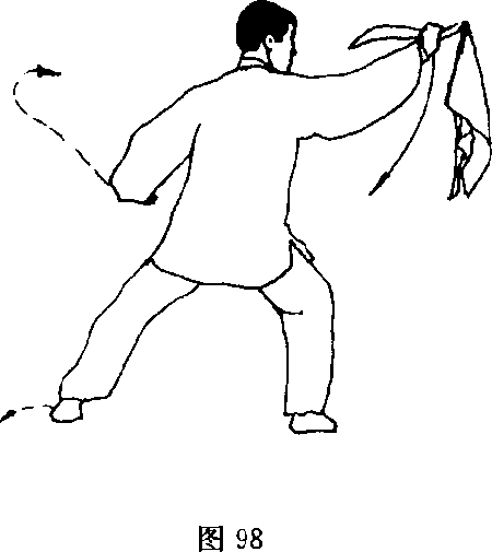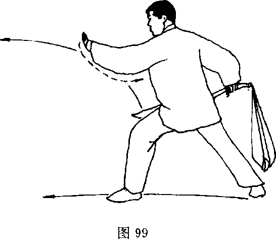 下,左掌随之向前横按,掌指向右,掌心斜向下,头向左转;目平视 前方(图99)。