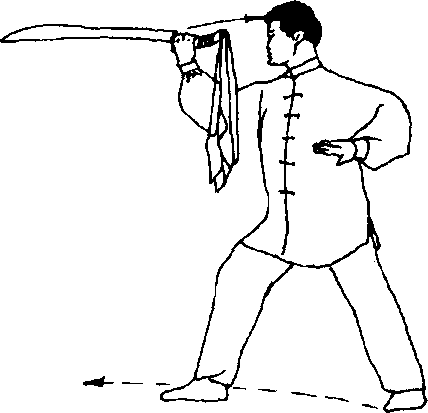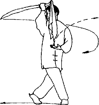 (1)接上势。上体左转,左脚经右脚右脚后向前插步;同时右手 持刀屈臂回抽至右肩上方,与头同高,刀刃向上,刀尖向后,左掌随 之前臂内旋,使掌心翻转向上至腹前,目随转身平视(图101)。