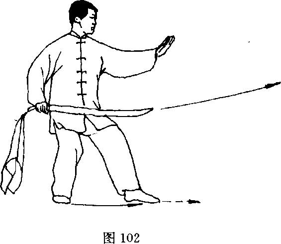 (2)上体略右转,右脚向后撤步,左脚自然内转成顺三体式步; 同时右于持刀经后背绕至左肩外侧回抽右甑侧,刀尖向前,刀刃朝 下,左掌随之前臂内旋,经刀背上向前劈出,掌心向下,高与肩平; 目视前方(图102)。