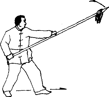接上势,右脚后退一步,重心稍后移同时右手迅速后撤至右 腰侧,左手向前滑握至枪身中段,使尖向上崩起,枪尖高与头平 (图 4)。