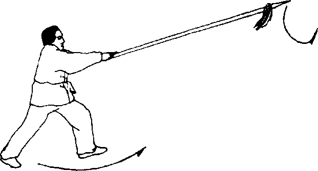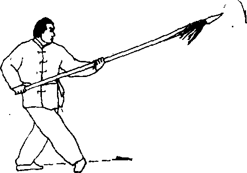 (1)接上式,右脚向前一步,脚尖外展同时右手握枪把,臂内 旋,左臂外旋,使枪尖向左侧划半个立园,枪头摆动直径为20? 30厘米左右,枪杆靠近身体,右臂紧贴右腰侧为拦枪(图5 — 1)。