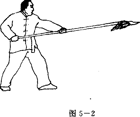 (3)重心前移成左弓步,右手推把向前平扎枪(图5 — 3)。