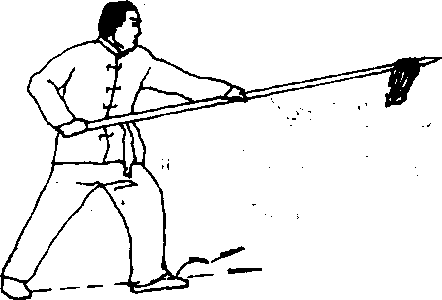 (2) 重心前移成右弓步,右手推把向前平扎枪;目视前方(图