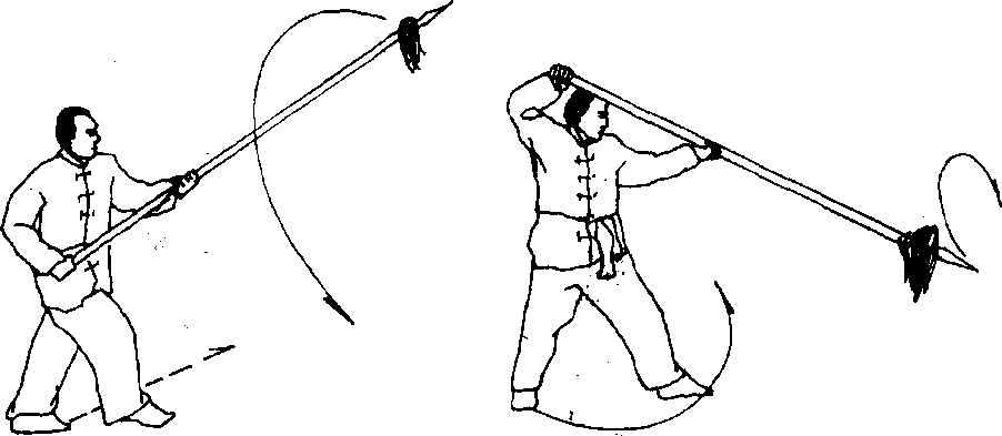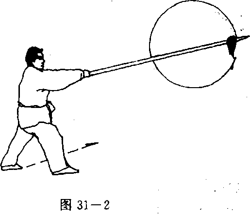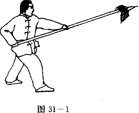 (2) 左脚向右斜前方上步,两平持枪向右斜前方斜架枪,枪尖 向下;目视前方(图30 — 2)。