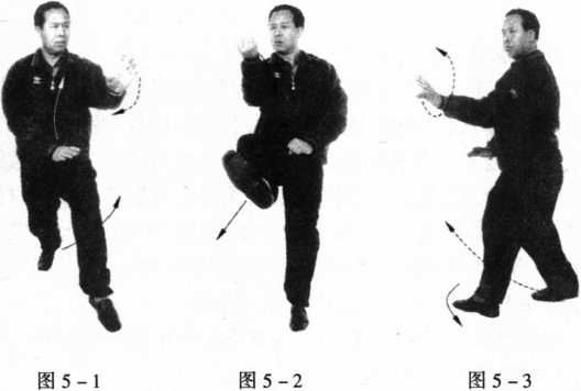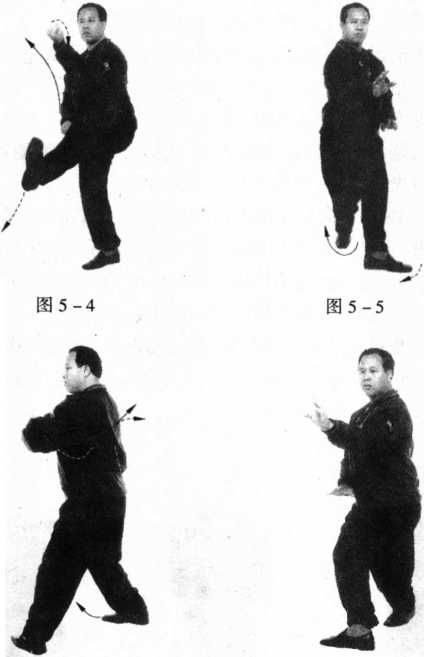 5 .转身式,左足在前右转身,右足在前左转身,图5 - 5所 示为左足在前右转身式。向右前方扣步,如图5-6所示。起右拳 蹬右足变右起势,再变左拗步龙形落式,如图5 - 7所示。