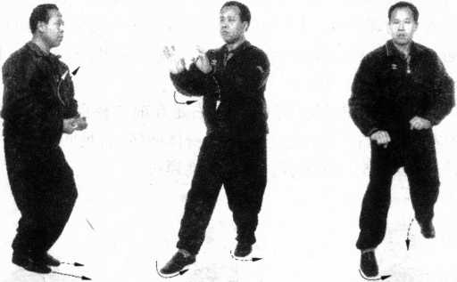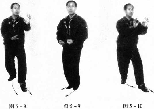 3 .转身式,左足在前右转身,右足在前左转身。图5 - 12所 示为右足在前左转身式。右足回扣身体左转,左足回撤并于右足 踝骨处,如图5 - 13、图5-9所示。