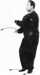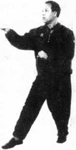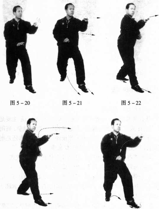 1 .三体式开始,马形右式,双手握拳,左足向前寸步,左拳 随左足同时向前刺出,右拳随右足同时向前打出直拳,如图5 - 20、图 5-21、图 5-22 所示。