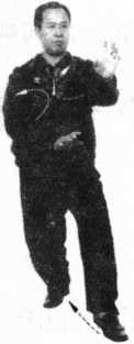 1 .三体式开始,燕形穿心足,如图5 -41、图5 -42所示。左 足回撤,足尖点地,右手在左手掌下交插穿出,并由两侧向下划 弧,掌心向下翻转成掌心向上托出,托出的同时左足进寸步,右 足向前蹬出,如图5-43所示。
