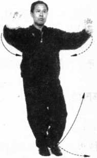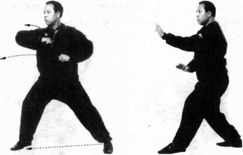 燕有抄水之妙,抄水就是侧面一圈之引化,向前合劲打撩阴 掌、击腹锤。双托手向上蹬穿心足,燕形抄水式可走偏门,迎前打 后击面掌。