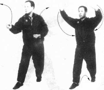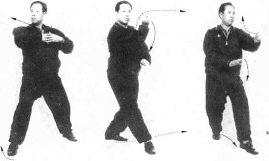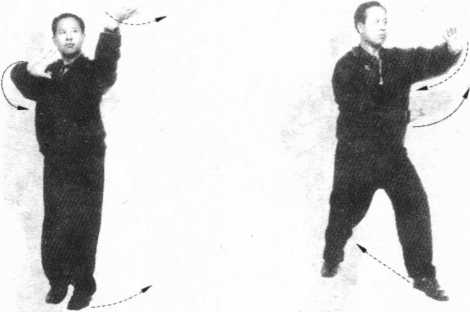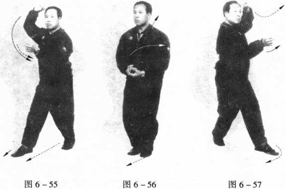 7 .左足向右足前方回扣,身体向右转,如图6-59、图6- 60所示,为春风摆柳第二式。进左足双掌向左前方横击,如图 6-61所示,为春风摆柳第三式。