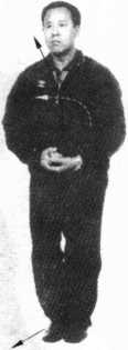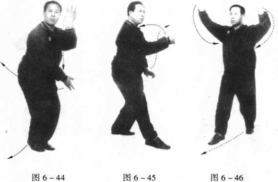 1 .由图6-43劈拳开始,上右步左缩身右挑领,如图6- 44、图6-45所示。