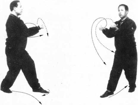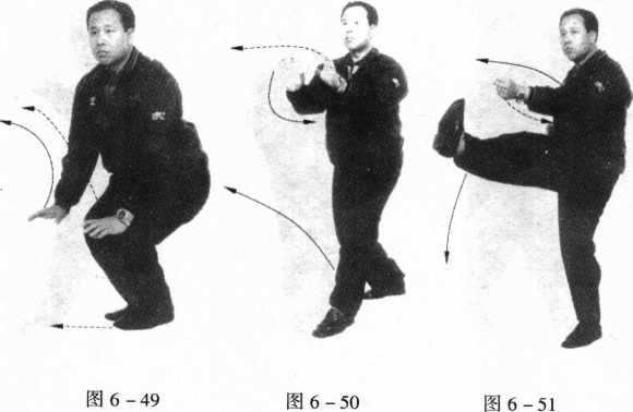2 .双分手上左足打左殆形,如图6-46、图6-47所示。上 右足打右殆形,如图6-48所示。