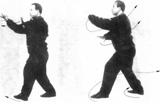 6 .两拳变掌向内裹拧,左足内扣后再向左前方进步横击, 如图6-58、图6-59所示,为春风摆柳第一式。