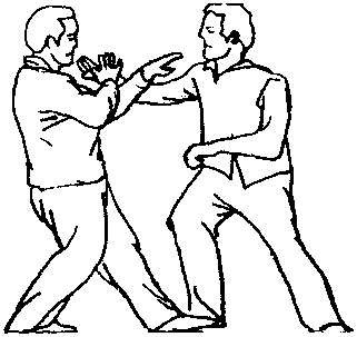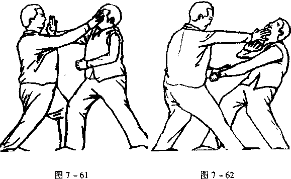 三换掌劈拳是在与彼交手时,走彼的右仪偏门,左手按肘, 右手劈打彼面的手法。彼身 法一变使我发手不实,我也 双手转拨,吸身换掌进身换 步又用右手劈拳,左手向前 扒盖右手又劈一拳,彼身法 再好,在连环三劈之下必被 我取之。三换掌劈拳属于身 法型妙手使用法,脱身换影 出手疾速,进步近身,脚由 偏门变中门,直踏而进,脚 手齐到方为真。连环劈拳一 气用,灵活巧妙把敌攻。图 7-63图 7-63图 7-63图 7-63