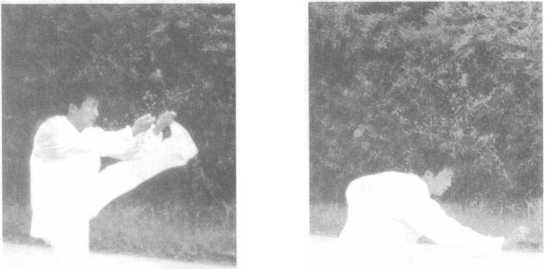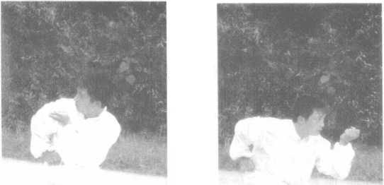 动作不停,腰胯迅速左旋身体下落,同时,左脚向前下方砸劈 (落地后.向外偏脚45。,脚心欠起),右拳也同时变爪向下劈抓(距 地30 cm左右,腕部向下塌住劲,五指曲回如钩),左手变爪拉回左 胯处(五指曲如钩),向下按住劲,向后拉住劲,整个身体伏下,小腹 贴左大腿上,后脚脚掌撑地,脚跟欠起向外扭住劲,重心偏于后脚? 眼看右手食指梢节。如图124所示。