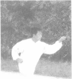 动作不停.两腿、两脚迅速撑 畛.腰胯右拧身体上起,左肩向前 上方顶起.重心前移偏右脚.同 时.左拳向前上方钻出(拳心向 上),高与口齐。右拳向后拉住劲? 向卜'按住劲.眼看左拳拇指凹槽 处如图122所示。