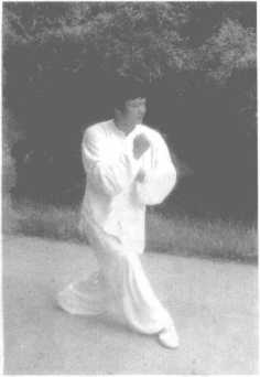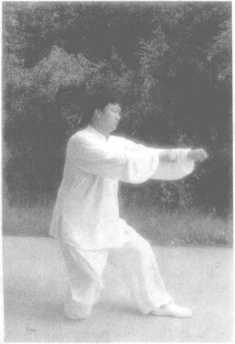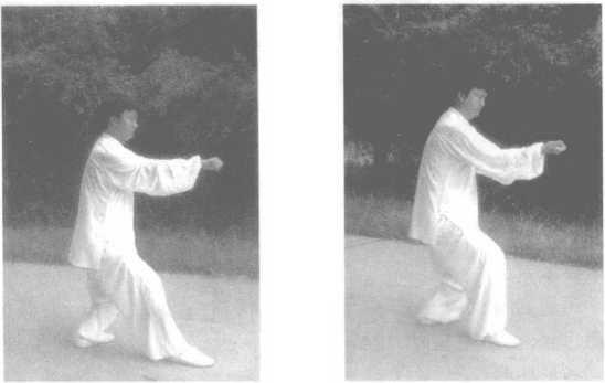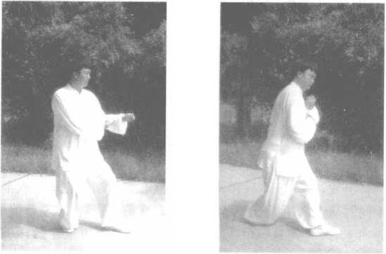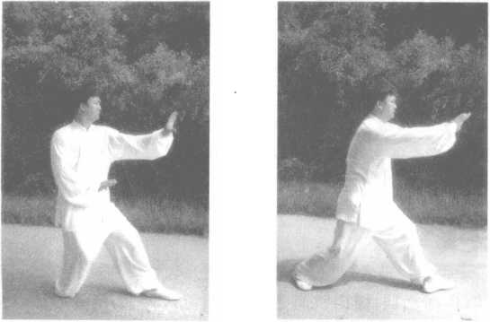 左脚不动,右脚后退半步,同时右手向前推出(两手相距4寸, 高与口齐),成左弓步状,两眼看两手中间。如图206所示。
