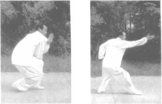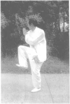 身体重心前移至右脚,左脚同时前移半步并迅速落下震脚(向 外偏脚45。),右脚同时提靠左膝内侧(脚尖勾起向正前方),左脚 震脚的同时,右手向外拧翻变掌向下划弧顺身子向左胳膊下穿插