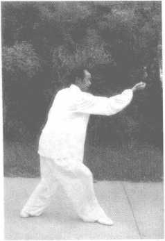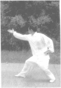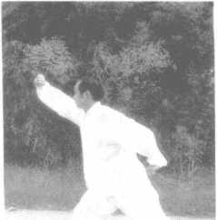 出去(掌心向外,手臂紧靠肋),左 手放掌向前上方挑靠右肩外侧, 向外推住劲.左腿微曲,身体向下 蹲住劲,束住劲,腰胯拧住劲,眼 看左手前方。如图245所示。